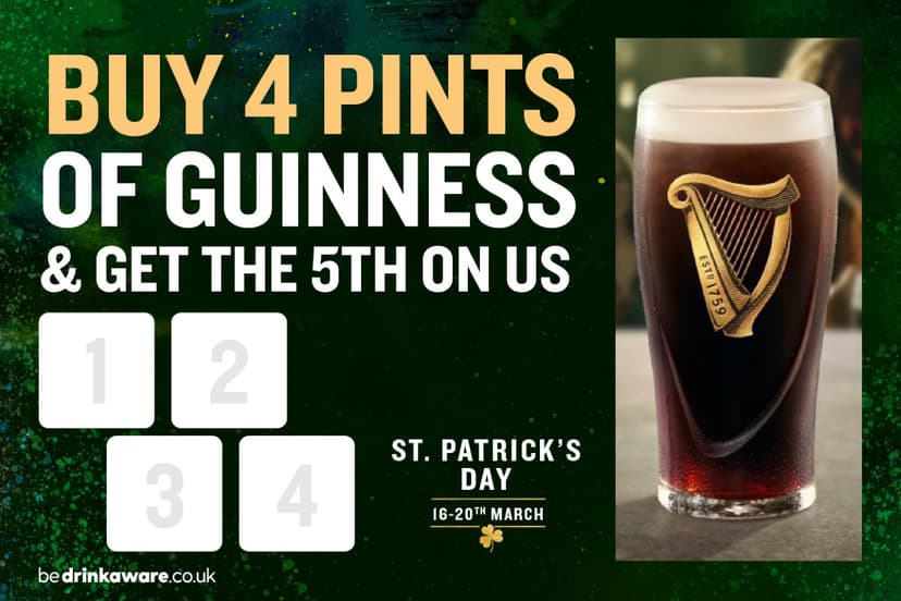 Between Monday 16th and Friday 20th March, buy 4 pints of Guinness to share at The White Bear and we’ll get your next pint of Guinness in, totally on us.
